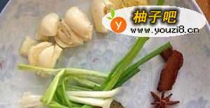 桂皮八角 香叶 辣椒 蒜姜改刀备用。葱打个结
