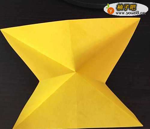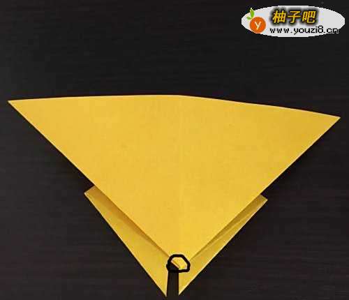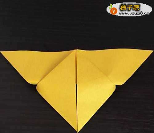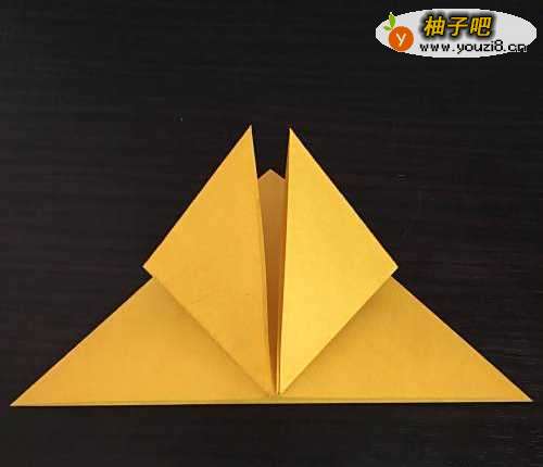3将其中一面的两个角沿中线向顶角折,得到下面的形状。