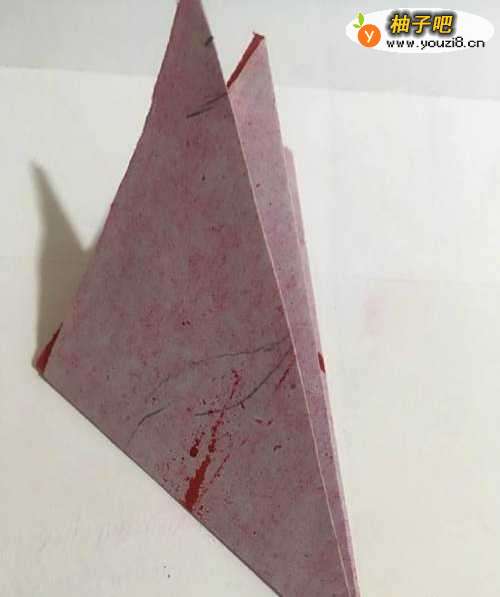 第一步 使用一张16厘米长 16厘米宽的正方形红色彩纸 先从下向上对角折叠整齐