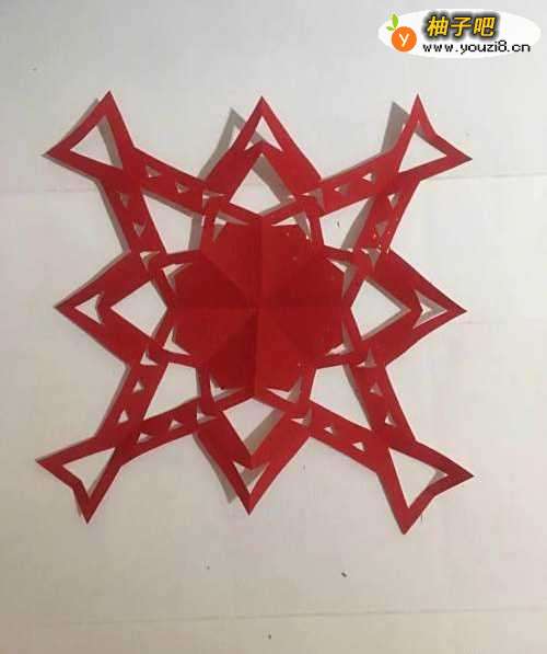 6第六步 多出来的彩纸都剪好之后 再连续裁剪里面需要挖空的部分 和其它涂实的部分 都剪完之后取开铺平 一副漂亮的直线条几何图案就剪好了
