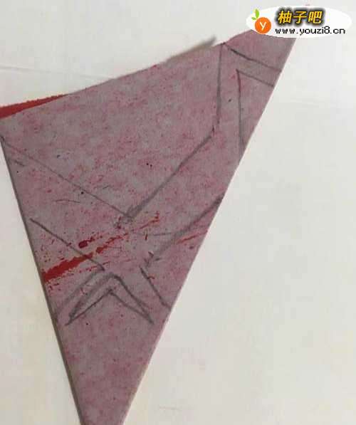 3第三步 折叠好了之后 调整一下 按图示摆放 然后拿过来绘图铅笔 先画上几条长短不齐的直线线条 里面空余的地方添上小三角形