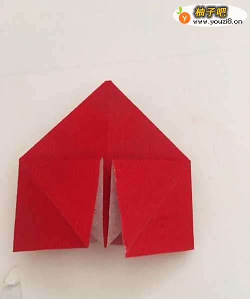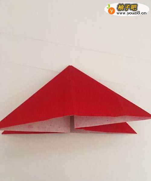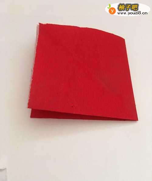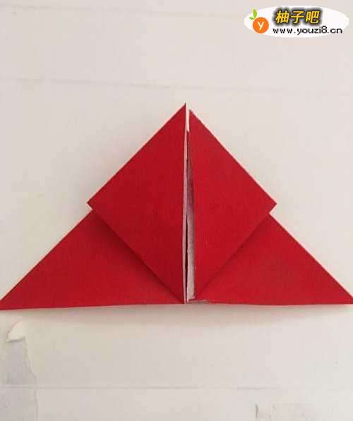 第一步 把一张14厘米X14厘米的红色彩纸 从下向上折叠 再从右向左折叠 然后再对角折叠 最后折叠成米字格