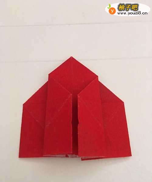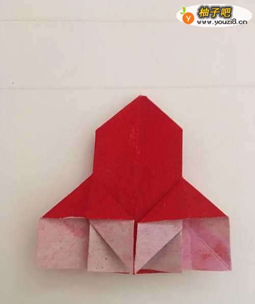6第六步 折叠完之后 取开两边的小长方形 按图示折倒压平 一个帅气的小火箭就折叠完成了