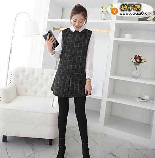 3格子连衣裙+黑色打底裤+及裸靴。超级时尚可爱的一款搭配,条纹格子不仅搭配起来时尚而且可以起到显瘦的效果哦,连衣短裙俏皮可爱,白色衬衣纹增加了活泼的感觉,彼得番娃娃领起到很好的衬托气氛的作用,在鞋袜颜色搭配上很统一、活泼。