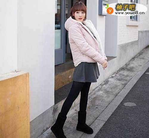 7棉衣+百褶裙+雪地靴。这款褶皱连衣裙的设计者可以说用心良苦,不仅可以很好的凸显出胸部的线条,同时腰间的褶皱设计又可以起到收腰的效果,可以看起来苗条很多哦,粉色的棉衣既可以起到保暖防寒的作用又可以出现在正式的场合,是学院风的一款减龄搭配哦。