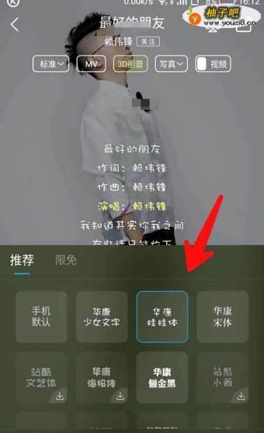 6选择自己喜欢的字体,然后点击“下载并使用”歌词字体就修改过来了