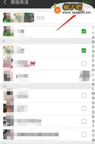 6选择号要关注的好友,点击好友后面的方框勾选,点击确定。