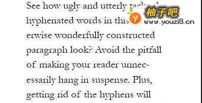 换行符是在一行末尾的单词,一分为二,然后用连接符来引导读者到下一行,现实却是这样的,换行符对文本的可读性来说并不是好事,看起来也很丑。调整你的台式刊印程序来去掉换行符,因为这是一个罕见的好的设计选择。