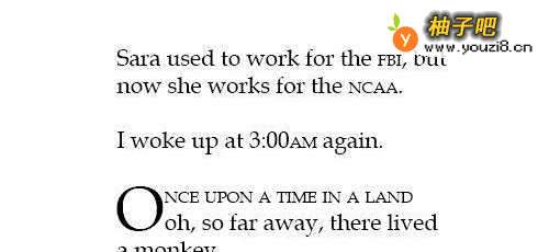 小型大写字母,类似于所有的大写字母,当文本中有一大段大写字母,可读性很难。然而,小型字母应该被用在缩写中,以便于不投放更多的注意在小型字母上,当然,使用小型字母在AM和PM中。你也可以在文章章节的第一行第一个字母使用大写,仅仅是为了视觉爱好。
