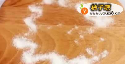 2时间到了把菜板拿出来,在上面撒一点食盐,然后用百洁布擦拭,另一面我们也要擦一下,擦完以后再用清水冲洗干净,接着用纸巾把菜板表面的水分擦干。