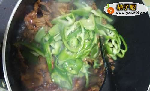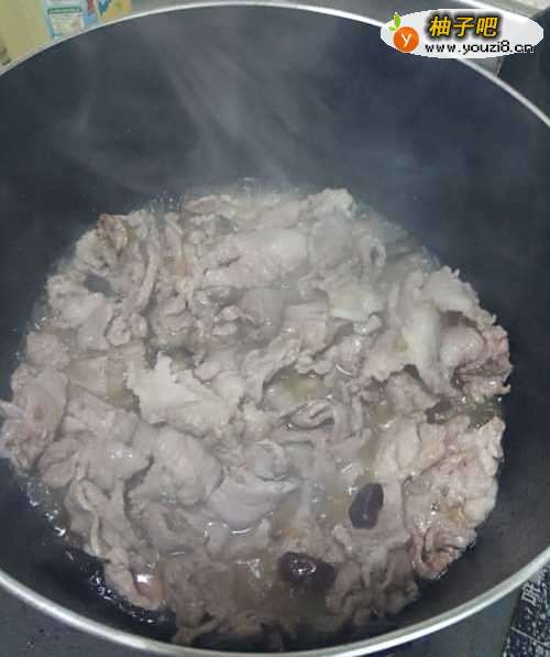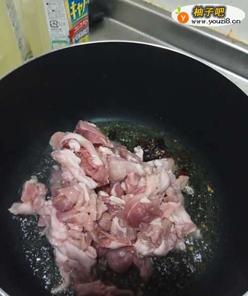 4辣椒爆香后,放入切好的猪肉片翻炒。