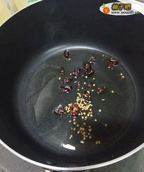 3取一个炒锅,锅中放入两勺油,开中火加热后,用剪刀把干辣椒剪成小段后放入锅中。