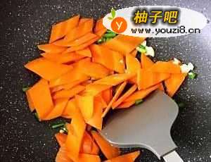4锅内留少许底油下葱蒜末爆香,然后倒入胡萝卜片翻炒1-2分钟。