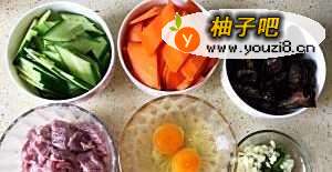 首先把里脊肉切片,加一勺淀粉一勺料酒腌制10-20分钟,腌制肉的过程可以把蔬菜洗干净,黄瓜、胡萝卜切成菱形片,木耳泡发,葱和蒜切成末,鸡蛋加小半勺盐打散。(黄瓜和胡萝卜切菱形片的方法:斜着把黄瓜、胡萝卜切成小段,然后立起来切片就是菱形的了)