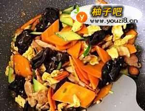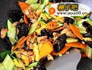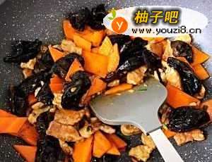 5然后倒入木耳和肉片翻炒,加入一勺生抽一勺蚝油翻炒片刻。