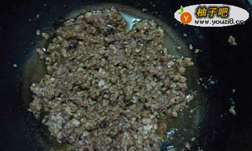 3开火,炒锅放油,油比平常炒菜的量多些,油开放入豆瓣酱,小火,然后把肉馅放进去,略加食盐,搅拌均匀,关火。