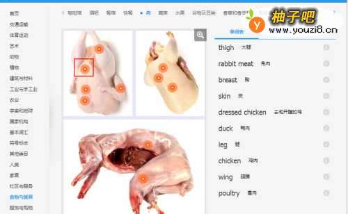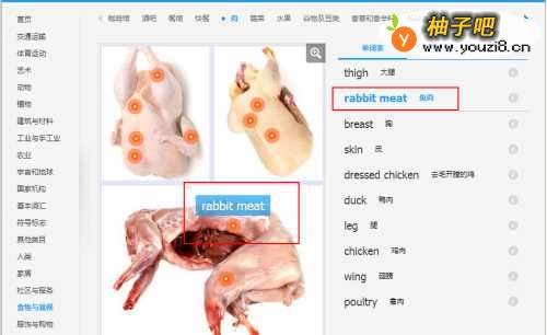 4可以根据学习需要,选择不同的模块进行单词的学习,比如兔肉和禽肉模块