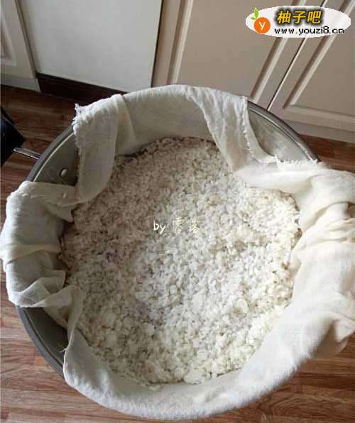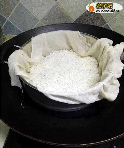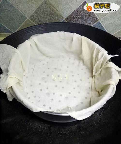 4蒸屉铺上蒸布;如果你家的蒸屉孔比较小,糯米不会漏下去,可以不用铺蒸布;