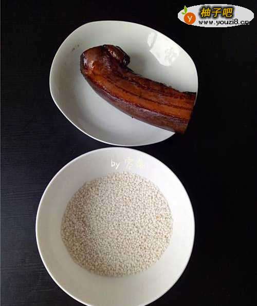 备好食材:腊肉,糯米;腊肉我只用了图中的1/2。