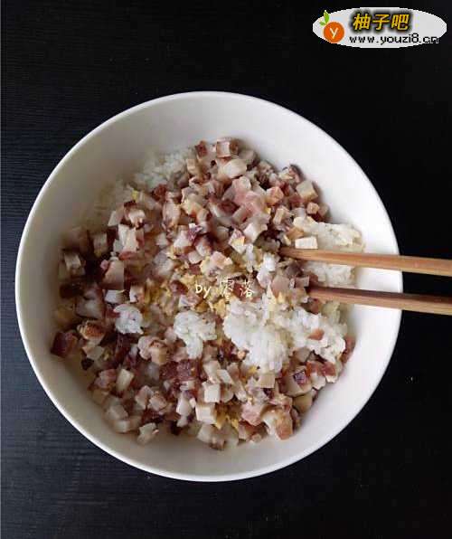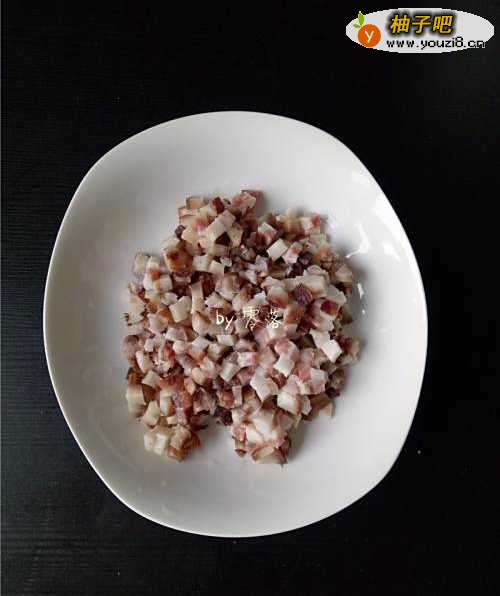 3腊肉用刀刃刮洗干净,切成腊肉丁;老姜洗净,切成姜末;鸡蛋打散;