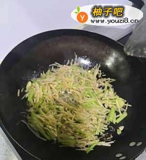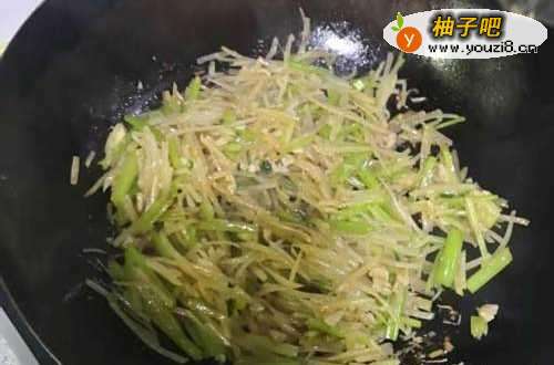 7.热锅中倒入少许花生油、猪油,油热后,先将肉丝煸炒、再倒入芹菜一同煸炒出锅;再将锅内放入少许花生油,将土豆爬爷丝倒入锅中,大火翻炒至金黄;最后将炒炒好的肉丝、芹菜、倒入锅中一同翻炒,爆出香味后倒入蒜末,滴几滴香醋,颠勺几下,出锅装盘。