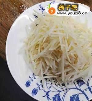 5猪里脊切成细丝用淀粉拌匀,保证在煸炒中肉的水分得到保留,肉更鲜脾牺独嫩