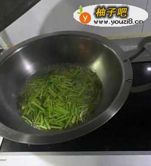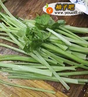 4烧开水,将切成小段的芹菜下锅焯水至再次开锅即可(不要煮),倒入事先准备好的凉水盆中过水,捞出装盘备用。(遇冷霸驾芹菜丝会脆掉,易嚼烂)