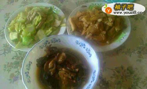 香菇肉。酱焖杏鲍菇。焖猪肉片。素炒韭菜。