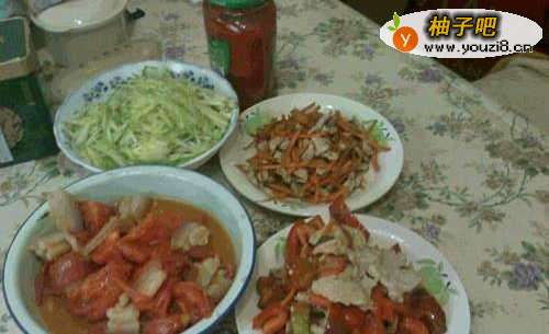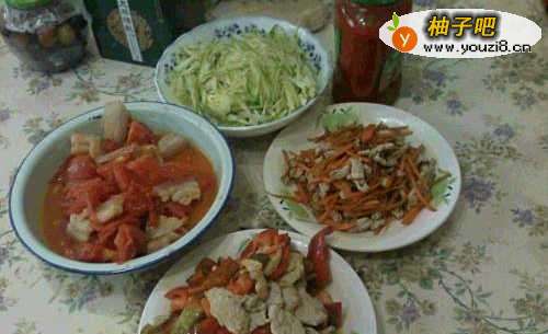 5辣椒猪肉片--西红柿肥肉片--黄瓜丝辣椒酱---猪肉丝胡萝卜丝。