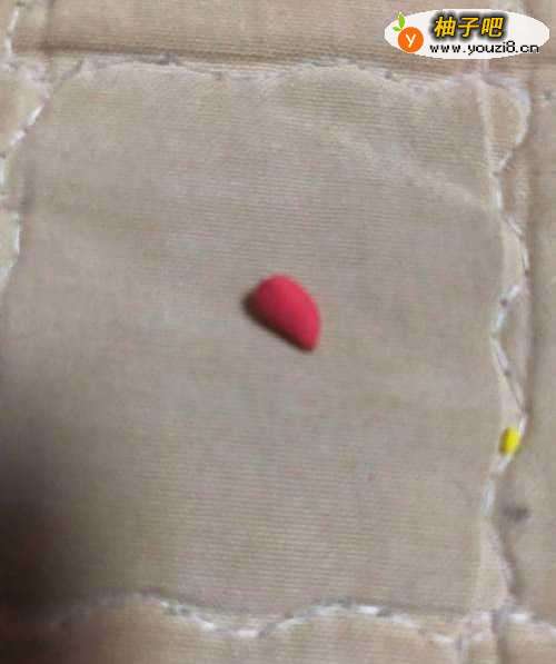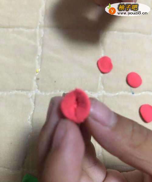 拿出红色的彩泥揉成小长条,在拿出红色的彩泥揉成大长条按扁。