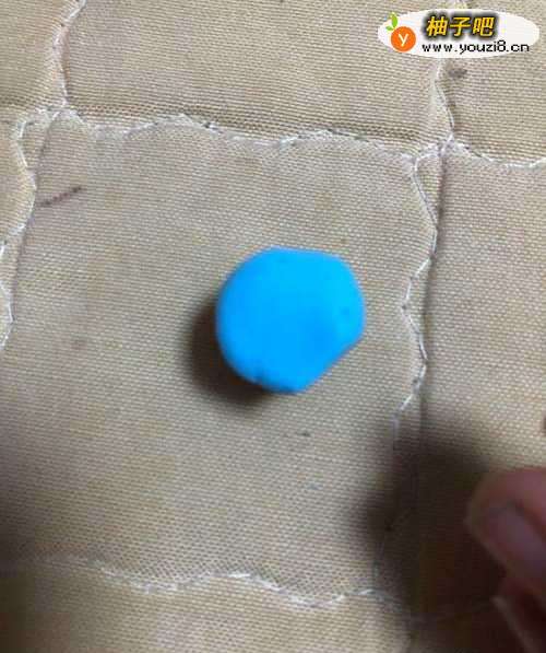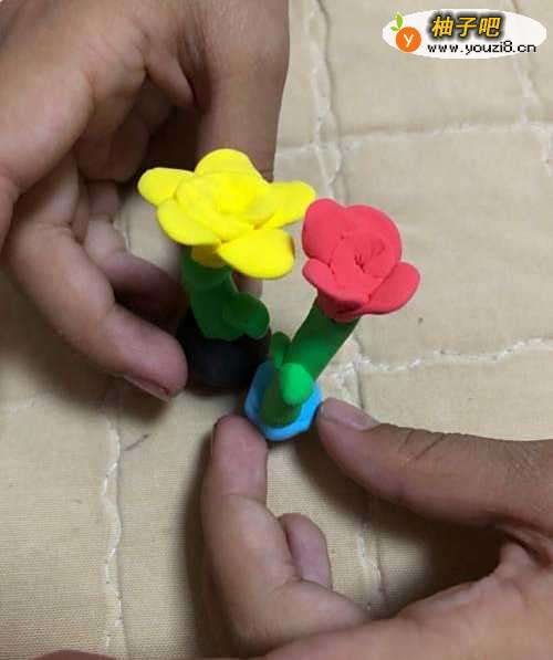 4在拿出蓝色的彩泥揉成正方形。当花盆,把做好的小花粘到上面。