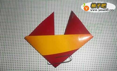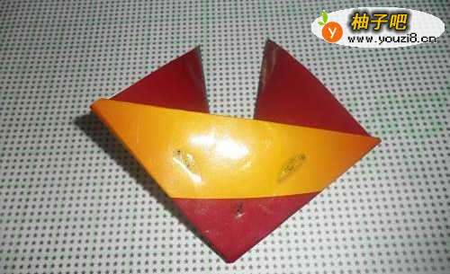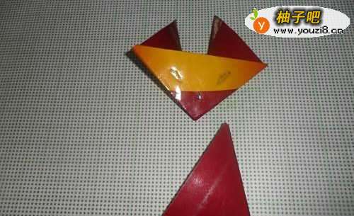 7现在来折狐狸的身体。将小正方形纸对角折两次,形成下图三角形状。将开口的边用双面胶粘住就好了。
