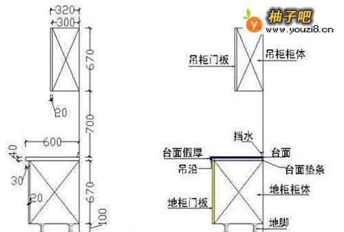 吊柜和地柜的深度一般都不同!地柜的在60cm左右 吊柜一般在30左右!