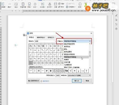 3在"符号"界面,选择字集为【带括号的字母数组】;