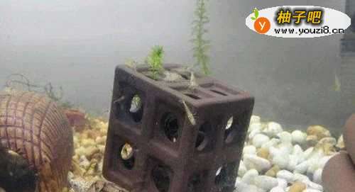 饲有黑壳虾的水族箱,除要同一般观赏鱼缸的布景和管理外,最好还要添加一些矿物质。矿物质一般选用“蒙脱石”,但因其价格较贵,通常用于水晶虾的饲养,笔者倒是觉得在饲有黑壳虾的缸里放一点“吸氨沸石”就可以提供足够的矿物质了。吸氨沸石里面通常包括两种岩质,一种易在水中溶解成粉末状,主要用来增加水里的矿物元素,另一种几乎不溶于水,主要用于吸附水中的氨和亚硝酸盐等有害物质。但是不能过量,否则出现浑水挂虾的情况,而且在添加时,块状的要比粒状的更适用。还有一种称作“生物石”的产品,有点类似于吸氨沸石,但是笔者认为效果远不及吸氨沸石。设置虾缸的时候,为了节约成本,不一定要建立完善的生物过滤,有物理和化学过滤就足够了。