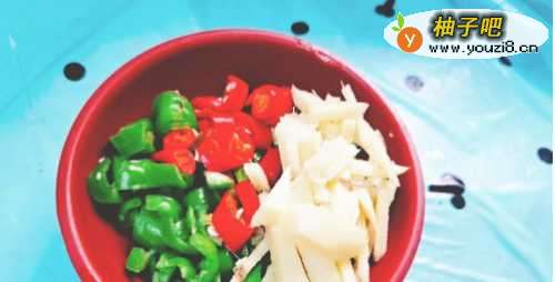 2把青红椒去籽切成段,生姜去皮切成丝。