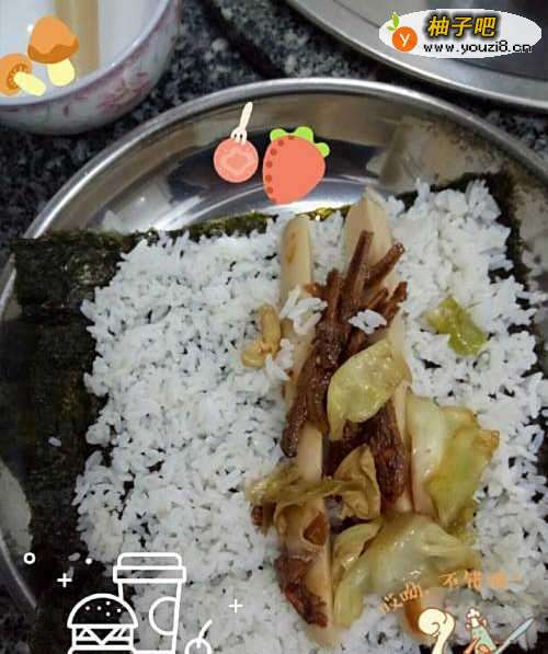 米饭中倒入寿司醋搅拌均匀,把米饭平铺在紫菜上,加上蔬菜、火腿肠、小鱼干、加些许沙拉酱