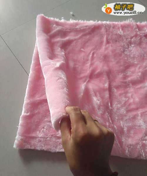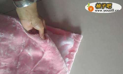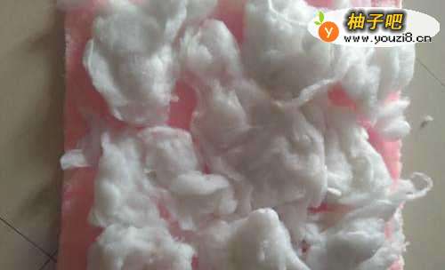 3一片毛毯放下面,然后铺上一些旧的丝绵,在距离毛毯边2厘米的地方不要放丝绵。