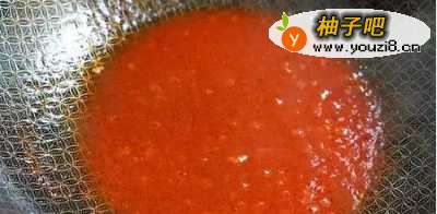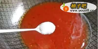 66、刷干净的锅烘干后,倒入少许油,再放入番茄酱、盐、糖、一小勺水慢火熬一熬。如果你觉得番茄酱还不够酸,你也可以再加点白醋。