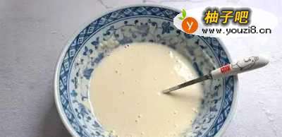 22、将面粉加入适量的水调成可以挂糊的面浆。水不要一次加,防止调的太稀。一定要能挂住糊才可以。