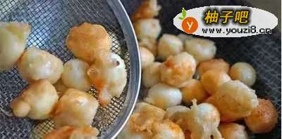 55、将炸至香脆的鹌鹑蛋捞出控油。
