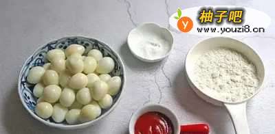 1、准备好所需食材,提前将鹌鹑蛋煮熟后剥壳洗干净。番茄酱家里没有的话,就自己用番茄做一下也可以哦!