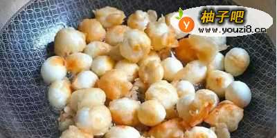 44、锅中烘干倒入一大碗油,烧至7成热,放入鹌鹑蛋炸至外表金黄状。
