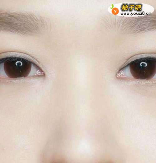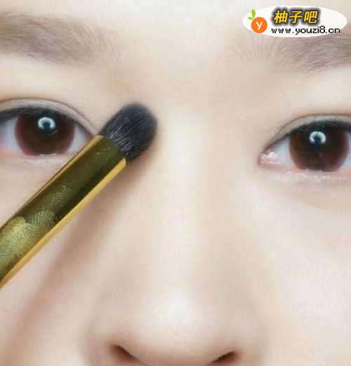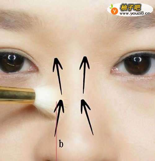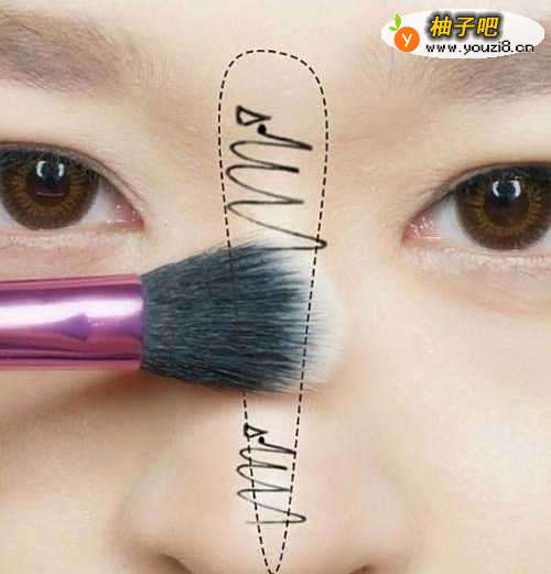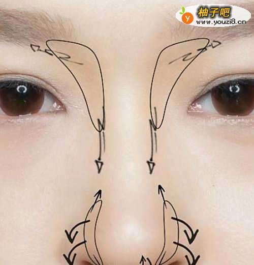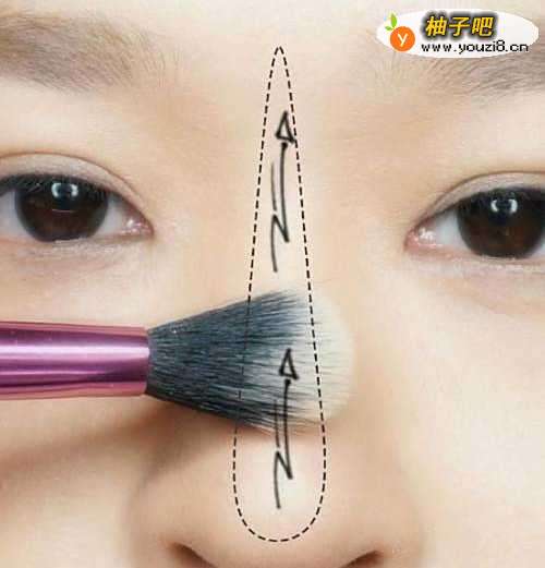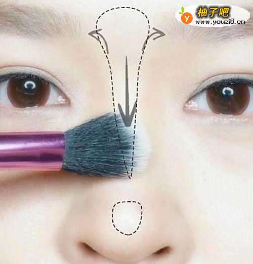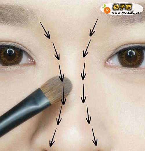 第一步:用扁头眼影刷沿着鼻梁两侧如同图中箭头指示一般从眉头处用“描”的形式,晕染到鼻头及鼻翼中间凹陷处,切勿化歪,否则鼻梁看起来就是歪的了。