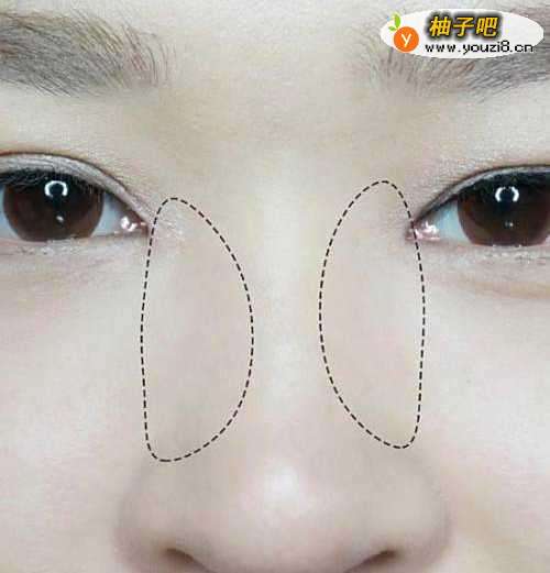 第一步:如果鼻梁比较宽,切记不要试图用阴影粉在图中圈住的地方一直打阴影粉试图让鼻子挺拔,因为鼻梁宽的部分也是有阴影的,如果一味的在宽的地方扫阴影粉只会让比较变得非常塌。