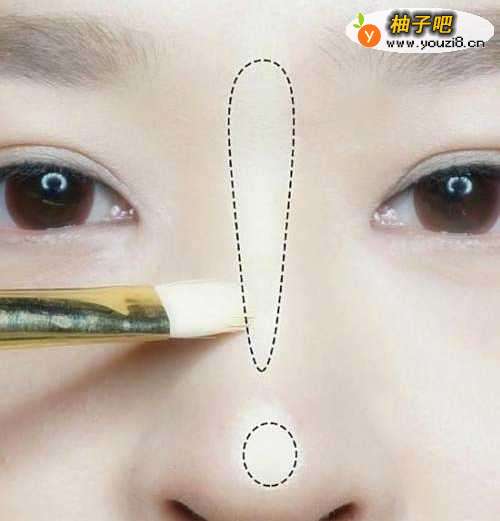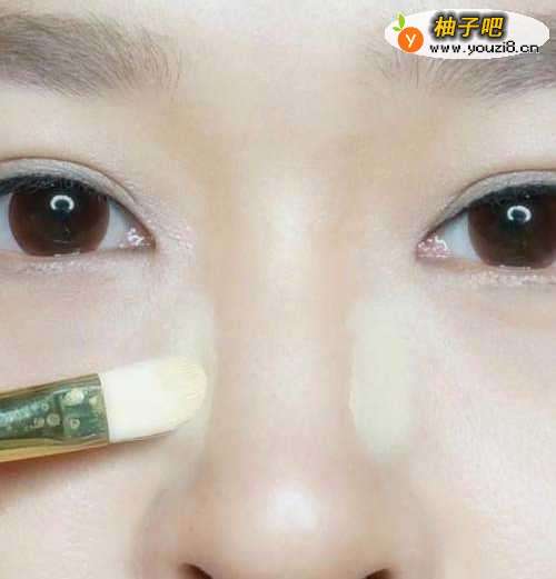 第一步:用比自身肤色浅的遮瑕膏或者修容膏在画阴影前现在鼻梁处遮瑕刷沾取膏状高光点在如图的位置,然后用海绵拍开,接着再进行之前说的那些步骤即可,三种鼻影方式根据自己条件选择。