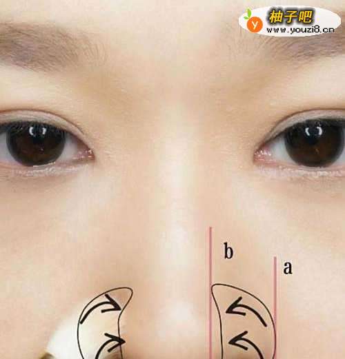 第一步:用阴影刷沾取阴影粉后在手心或者虎口揉一揉,确保阴影粉均匀的附着在刷毛上后,从鼻翼的根部a点起笔单向的刷向鼻翼与鼻头的沟壑b点。
