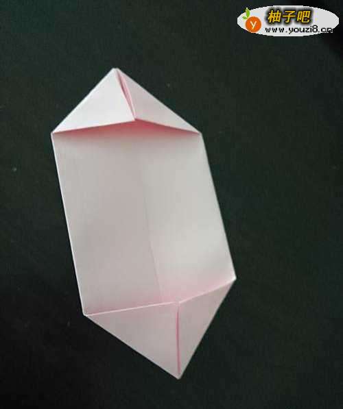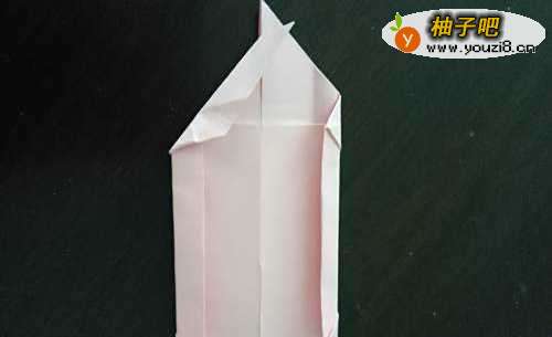 4刚才对折的旁边再向里对折,折回来,把角折上去,打开,反转,将多余的头塞进边
