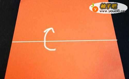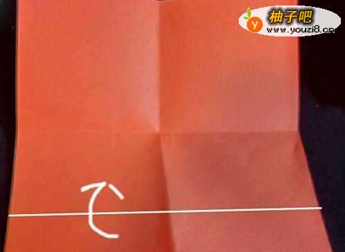 2将展开后的彩纸,横向折叠,等分成四份,留下清晰的折痕后,再次重新展开。见下图1划线的位置,将底边沿着这道折痕向中间方向折叠。