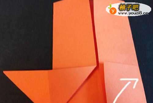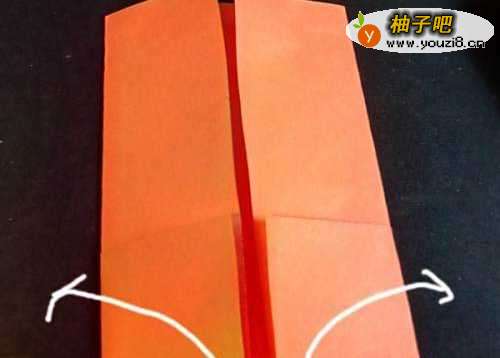 4上一步骤对折后的效果,可以参见下图1所示,然后按着图中箭头指向的方向,将下方两个小四边形,用手指撑开,向两侧拉伸。